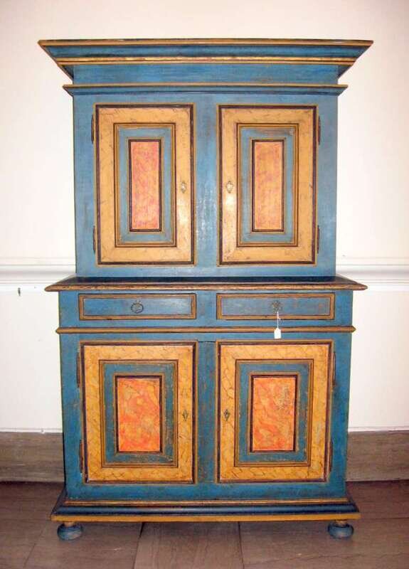 In two parts; the upper section with a molded cornice above two paneled cupboard doors and two short drawers; the lower section with two paneled cupboard doors, ending in flattened bun feet.