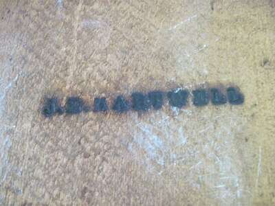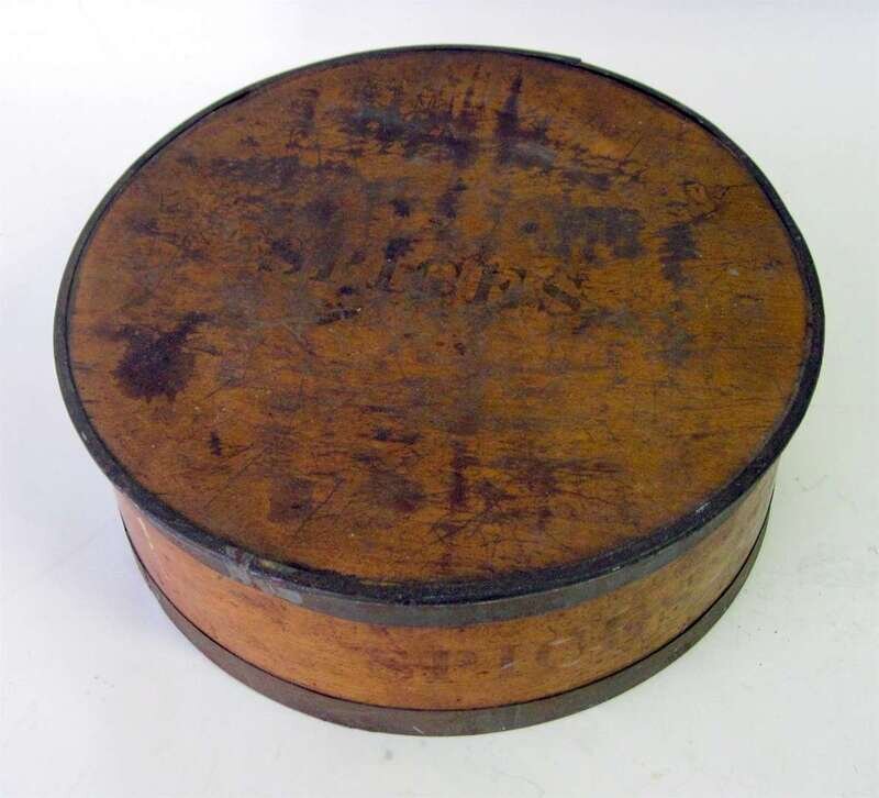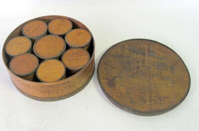 Cylindrical, fitted with eight containers, all with stenciled labels; underside with branded 'J.B. Hartwell'.