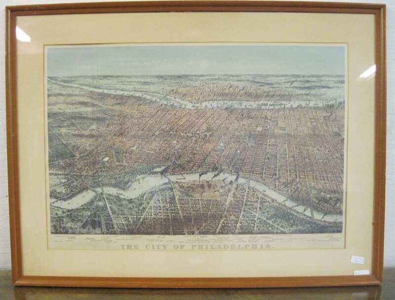 The rectangular mirror plate enclosed by a plain frame; together with a reproduction Currier & Ives print of the City of Philadelphia. (2).