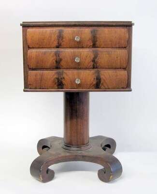 The square top with molded edge above three short drawers, raised on a column support and scroll feet.
