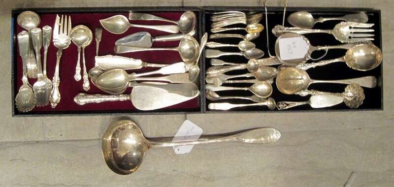 Comprising an International Silver Co. 'Stratford' pattern cold meat fork, W. Faber & Sons bright cut serving spoon, Reed & Barton vegetable serving spoon, Whiting 'Lily' pattern gravy ladle, 8 Gorham demitassespoons, 4 Towle 'Benjamin Franklin' pattern salad forks, 3 pie servers, Dominick & Haff claw-form sugar tongs and various other pieces.