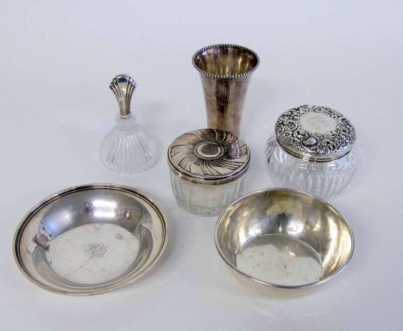 Comprising a S. Kirk & Sons bowl, candy bowl, a Dominick & Haff beaded edge vase, a Towle perfume bottle; a Gorham foliate repousse powder jar and a Towle powder jar. (6).