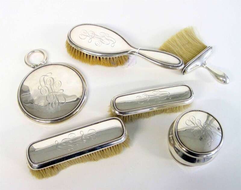 Comprising a hand mirror, hair brush, powder jar, whisk brush and two graduated clothes brushes; each plain with beaded edges. (6).