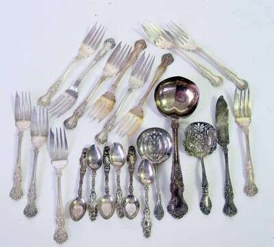 Comprising 12 fish forks, a gravy ladle and master butter knife; together with 6 Gorham 'Lily' pattern demitasse spoons and Gorham two sugar sifters. (22).
