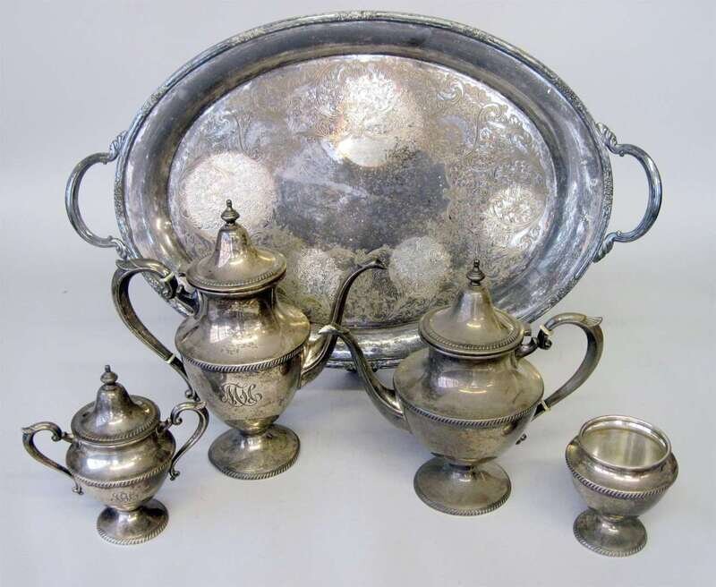 Comprising a coffee pot, tea pot, cream jug, waste bowl and sugar bowl; together with a silver plate serving tray. (6).
