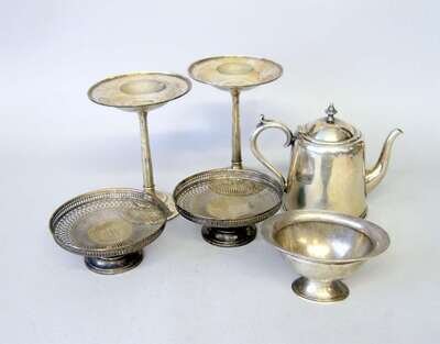 Comprising two pairs of tazzae and a Tiffany & Co. bon bon dish; together with a Sheffield plate teapot. (6).