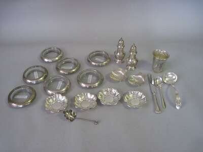 Comprising a Russian engraved silver beaker, St. Petersburg, 19th century, maker's initials 'XS'; pair of Graff, Washburne & Dunn salt and pepper shakers; pair of Mexican silver open salts; set of four F.B. Rogers Co. flower-form nut dishes; set of 7 Whiting glass and silver bottle coaster; Codding Bros. bon bon spoon; Frank Smith 'Woodlily' pattern gravy ladle and two carving knives.