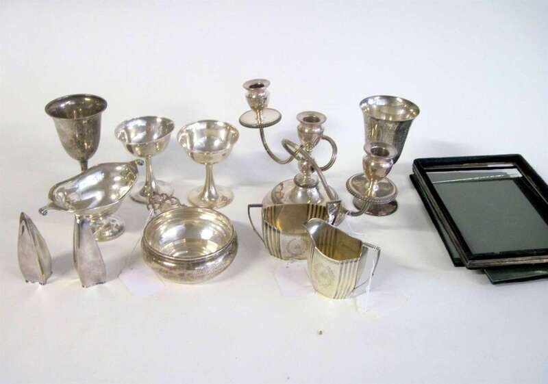 Comprising two Gorham goblets, 2 Gorham cocktail stands, Durgin Neoclassical style creamer and sugar, Revere style porringer, Tuttle double lipped sauce bowl; hip flask and S. Kirk & Sons shot glass and weighted base low twin light candelabrum; Mauser candlestick and double mirror frame; together with a pair of Danish salt and pepper shakers. .