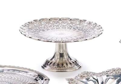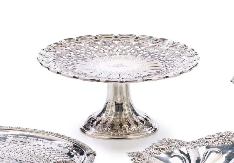 With a scalloped edge with shell and pierced heart shaped decoration on a conforming base.