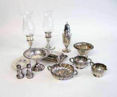 Comprising a pair of Fred Hirsh Co. weighted base console candlesticks with glass hurricane shades; Gorham weighted candy compote, Whiting urn-form sugar sifter, a Kirk sauce bowl, covered butter dish with glass liner, small sauce boat tray, Kirks & Sons compote and J.F. Fradley & Co. salt and pepper shakers; together with a Mexican lobed creamer and sugar bowl and twin handled candy bowl and miscellaneous German flatware. .