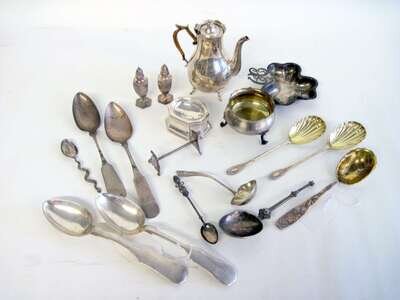 Comprising a small Gorham coffeepot, an Edwardian clover-form dish, Sheffield; a Georgian style master salt, Thomas Bradbury & Sons., London; pair of Edwardian silver serving spoons; a Redlich sugar bowl; a Whiting strawberry pattern parcel gilt serving spoon; two Russian silver serving spoons and various other serving pieces.