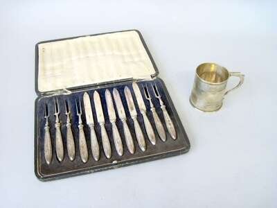 Comprising a Georgian child's mug by William Sumner, London, 1786 and a boxed sterling and plated fruit service by Sutherland & Roden, Sheffield, early 20th century.