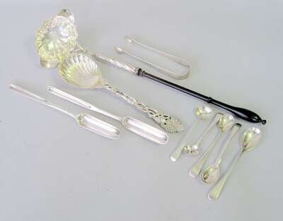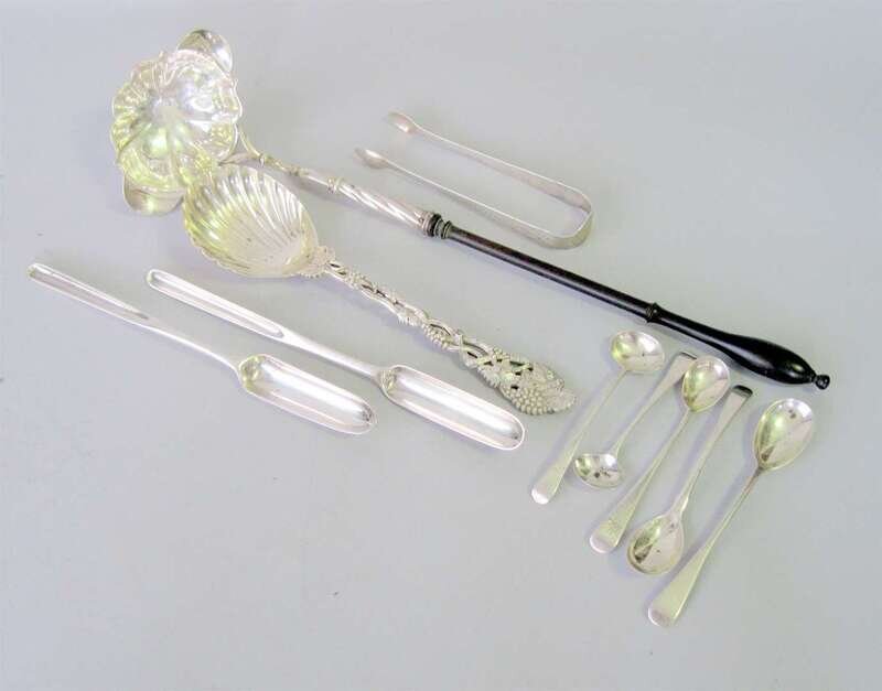 Comprising a toddy ladle, london, circa 1760 with a treen handle; bright cut sugar tongs, maker's mark 'TE'; 5 mustard spoons, a marrow scoop, London, 1800 by 'ML'; another 18th century marrow scoop; together with an English grape-vine twist jelly spoon, london, 1925. (9).