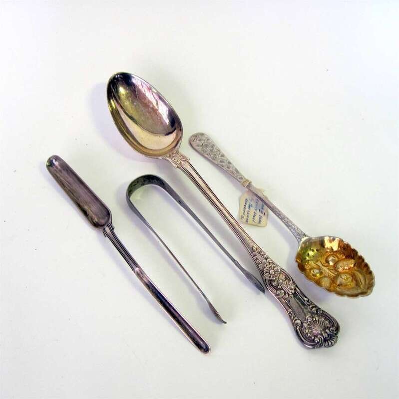 Comprising an early Victorian stuffing spoon, John James Whiting, London, 1841; a Georgian parcel gilt berry spoon, John Langlands, Newcastle, 1801; Georgian sugar nips, London, 1804 and a Victorian marrow scoop, London, 1839. (4).