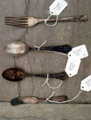 Two teaspoons, luncheon fork and flat butter spreader, assorted.