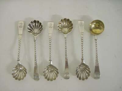 Six silver salt spoons stamped 'p.r', 18th/19th century