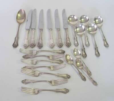 Comprising 6 dinner knives, 5 soup spoons, 1 serving spoon, 5 salad forks, 2 dinner forks and 3 teaspoons. (22).