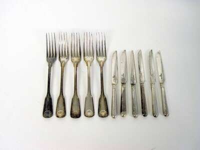 Comprising five French 'Shell & Thread' pattern dinner forks by Emile Puiforcat and six Russian silver fruit knives, possibly by 'Pavel Ovchinnikov' stamped 84. (11).