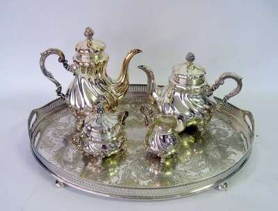 Comprising a coffeepot, teapot, cream jug and sugar bowl; each of baluster form, with a swirl body and foliate knop; together with a silver plate serving tray. (5).