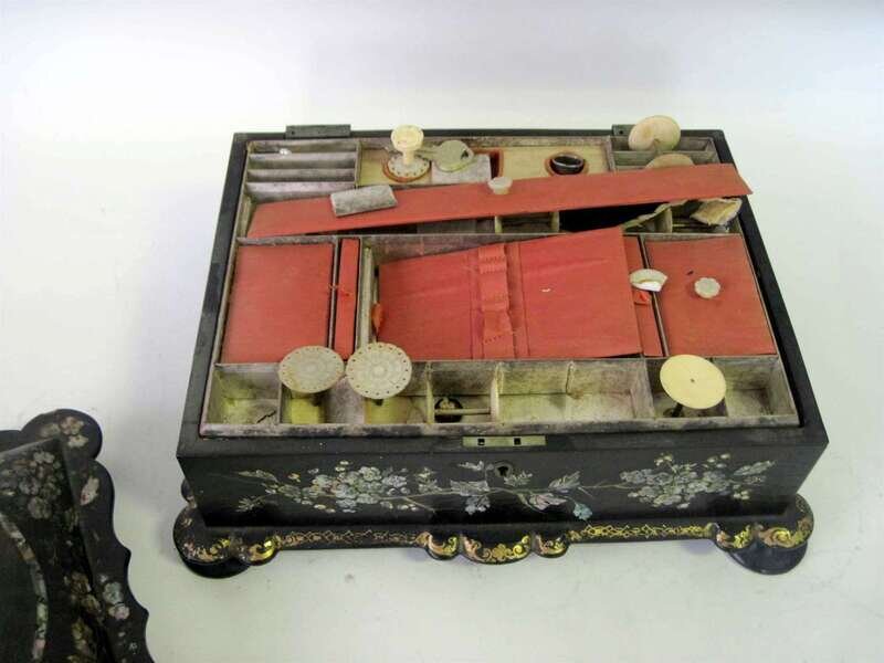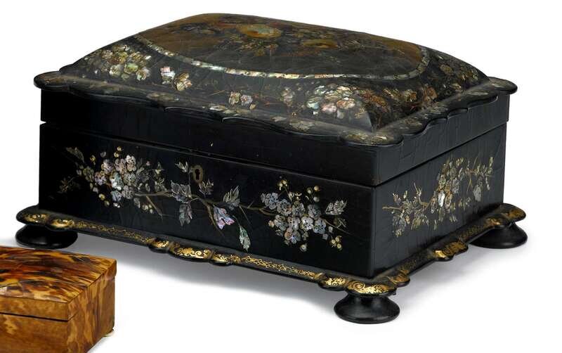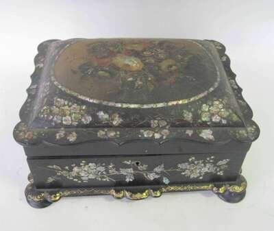 Victorian painted, mother-of-pearl inlaid and ebonized papier mache work box mid-late 19th century