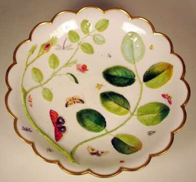 With a scalloped gilt rim, enclosing raised decoration of leaves and blossoms, raised on a circular foot.
