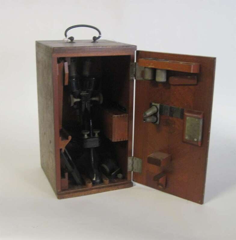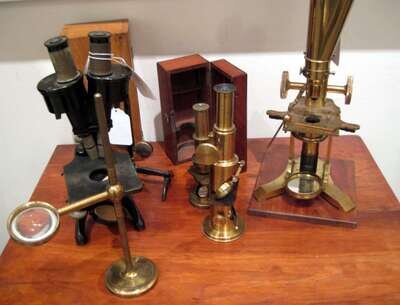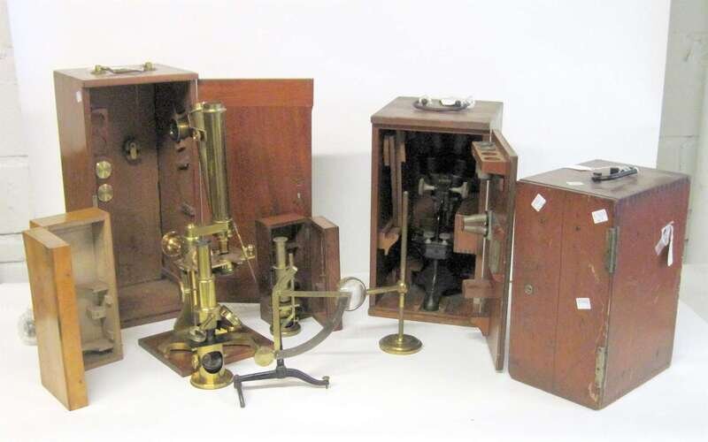 Comprising a Spencer Lens Co., brass and ebonized microscope, a large brass binocular microscope on stand; a Carl Zeiss lacquered brass binocular microscope, with various lens and fittings; in a fitted case; a magnifying lens on stand and two small microscopes.
