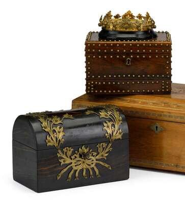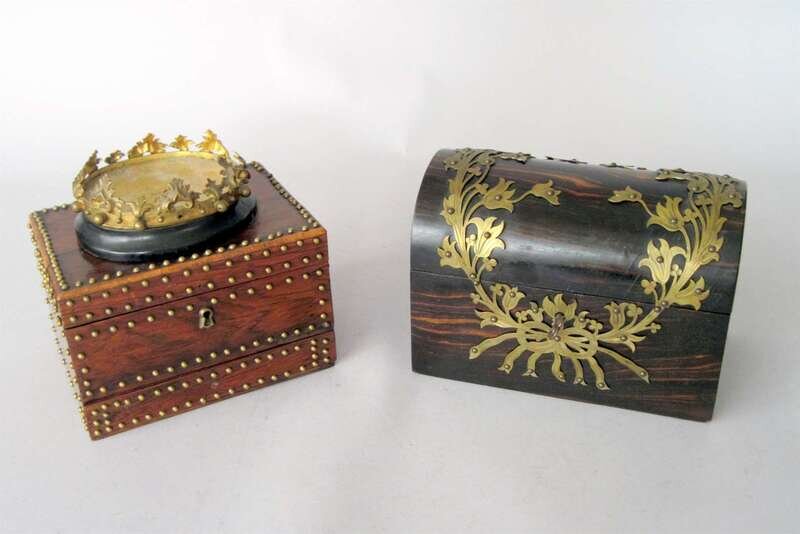 Comprising a domed table box, mounted with brass ribbon-tied foliate sprays and a Continental dressing box, of rectangular form, with a 'crown' form hinged compartment to the top, interior with mirror, above a short drawer, the whole with studs. (2).