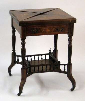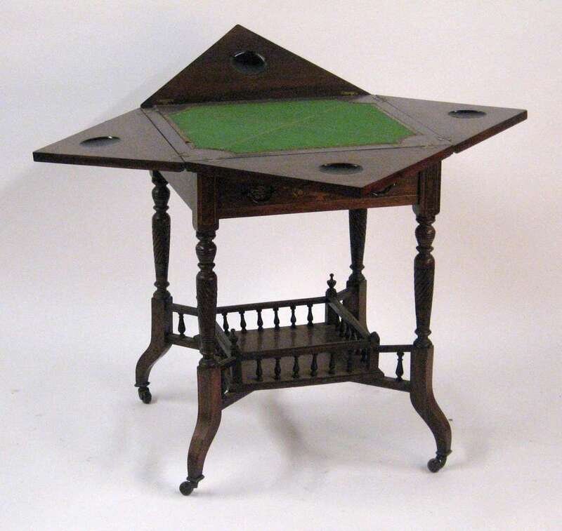 The envelope top, opening to reveal a baize playing surface above a single drawer, raised on four outswept legs.