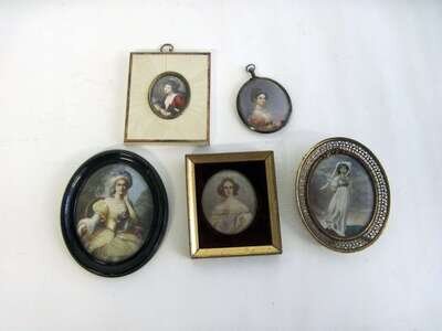 Painted in various medias; comprising a portrait of Lady Hamilton after George Romney; a woman, in a silver frame; portrait of a woman in 18th century dress after A. Plimer and two other portraits; framed. (5).