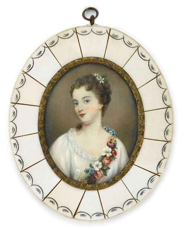 Oval, watercolor on paper; depicting a young woman with a floral garland over one shoulder; signed 'V-Lebrun'.