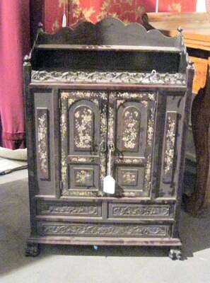 The 3/4 gallery above two paneled doors, inlaid with mother-of-pearl foliate decoration, above two short and one long drawers, raised on ball and claw feet.