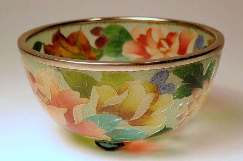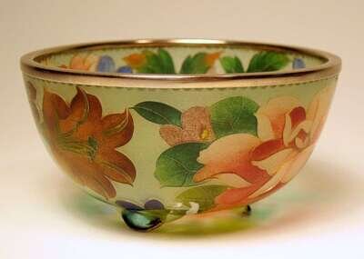 Decorated with polychrome enamel flowers; silver mounted rim and feet.