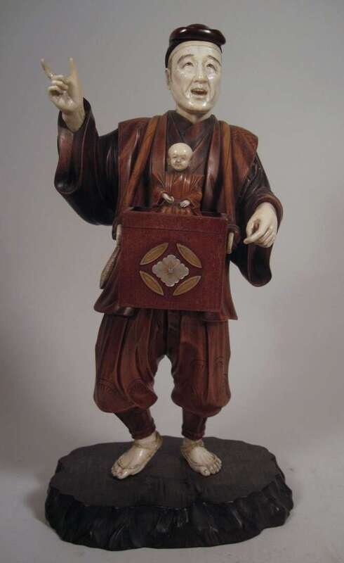 The male figures holds a fortune telling box to his chest; worked with ivory head, hands, and feet; the body and headdress is of carved and colored hardwood; mounted to a carved wooden base.