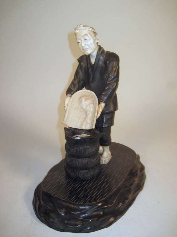 Worked in bronze with ivory face, feet and rice; the male figure is sorting rice into a basket; on a wooden base.