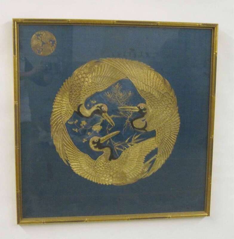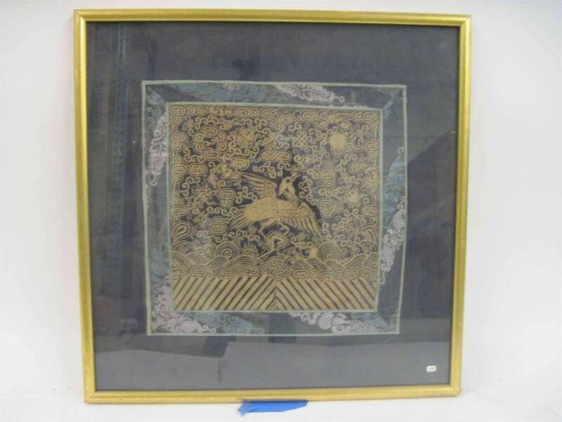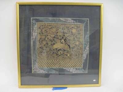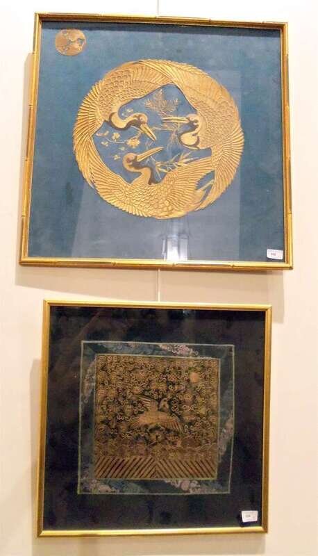 Comprising a Kesi badge; each worked in gilt threads, on a blue cloth; framed and glazed. (2).