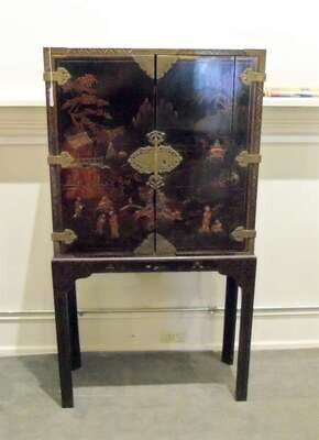 Tall rectangular chest, with two cupboard doors, decorated with a figural landscape, over later conforming stand.