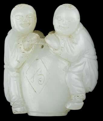 The hollowed pendant carved as two boys hanging on a large barrel that is inscribed with fu characters.
