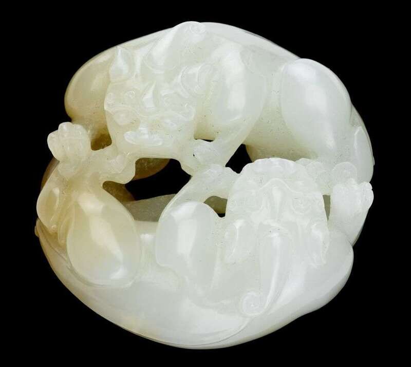 Chinese white jade carving of two intertwined fu lions qing dynasty