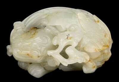 The crouching beast depicted with typical features and holding a lingzhi stalk in its mouth; stone of white hue with some striated inclusions.