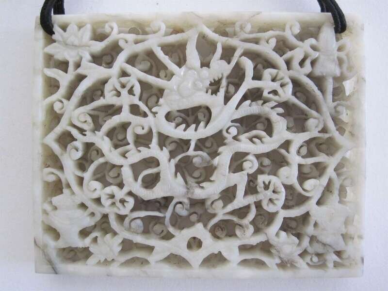 The rectangular plaque carved in intricate, two-layer reticulation to show a coiling dragon among lotus scrolls; stone of slight celadon hue.
