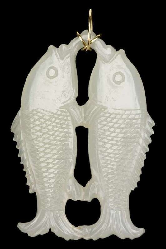 The openwork pendant depicts two hanging scaly fish joined at the mouth.
