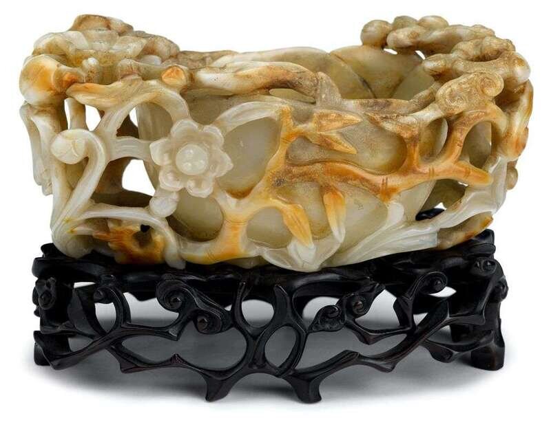 The organic, lotus-form washer carved extensively to exterior with openwork vines bearing lotus blossoms, peaches and lingzhi.