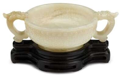 The diminutive, shallow cup carved with two qilong handles, an everted footring and an intricately-studded exterior.