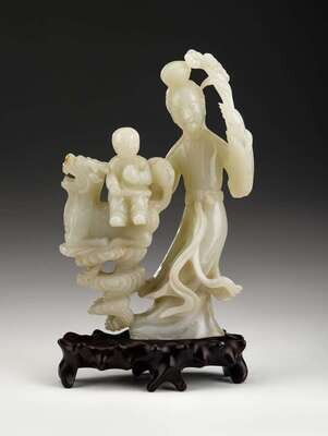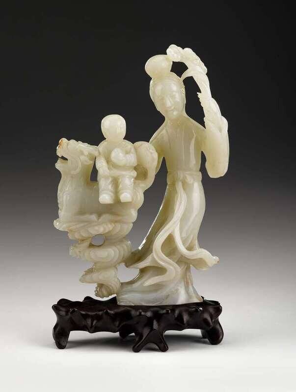 The large, openwork carving depicts a gracefully-attired meiren holding a lingzhi stalk standing beside a cloud of vapor that supports a young boy with a peach who sits upon a kirin; stone of good white hue with very minor pebbled inclusions.