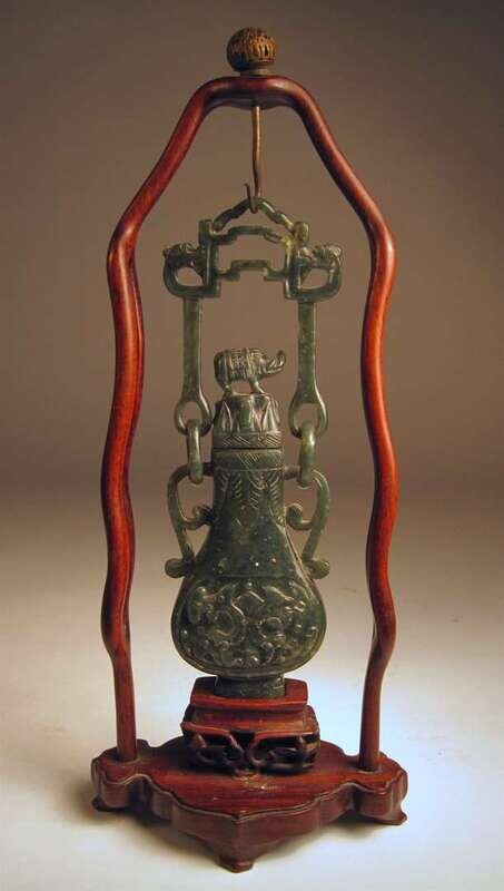 The small and traditional hu form covered vase with a mask carving to body and an elephant finial to lid suspended by same-piece articulated hanging rods and yoke; with custom wooden base and hanging bar.