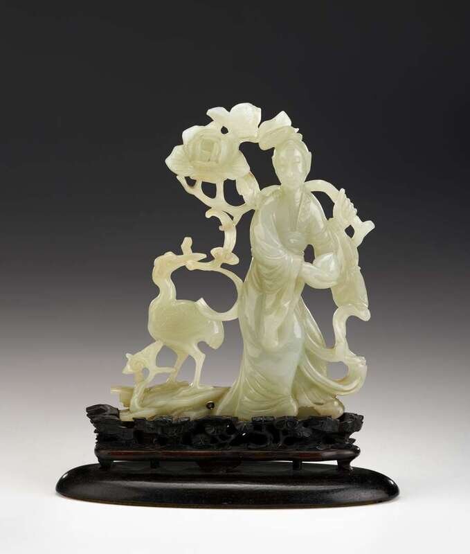 The openwork and somewhat flattened carving depicts a meiren holding a peach and a large rose beside a crane that holds a lingzhi stalk in its beak; mounted to a hardwood stand.