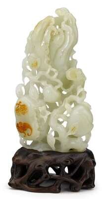 The detailed openwork carving shows a large Buddha's hand citron, pomegranate and other fruits on a leafy branch; stone of true white hue and with cameo carved fu bats in russet pebble skin.