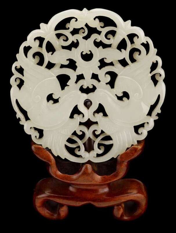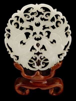 Circular open-work plaque carved to show twin ducks, on wood stand.