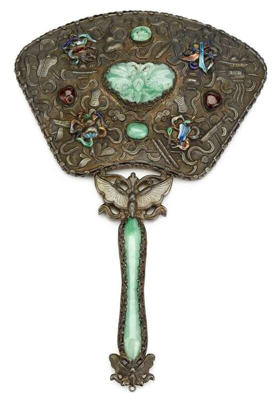 Chinese green jadeite mounted enameled silver hand mirror 19th century