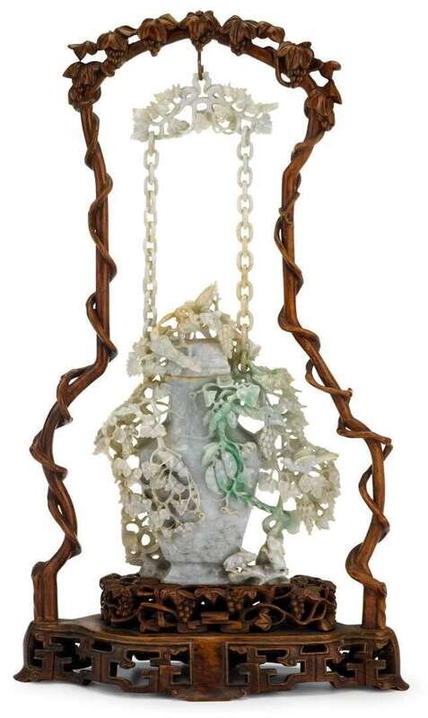 The intricately carved openwork vase of baluster form and surrounded by leafy branches with hanging grapes, bean pods on the vine, birds and a pair of rabbits; with carved jadeite chain and openwork yoke and carved wooden stand and hanging bar; stone of varying grey to celadon hue with apple green highlights.